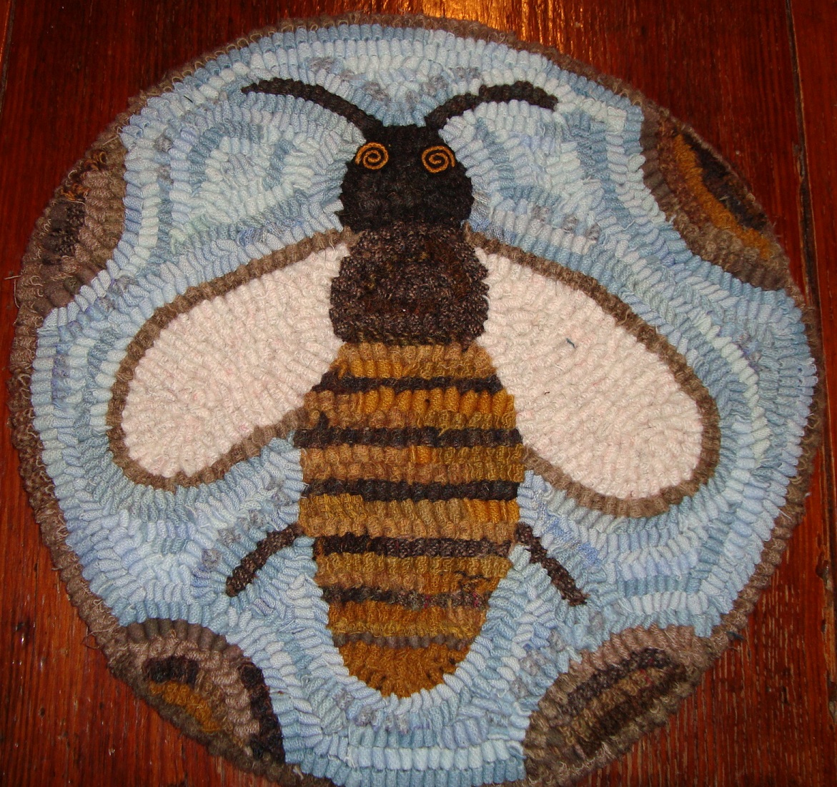 This mat has sold BUT, I would happily make another, just contact me. Isn't this mat the cutest thing ever? The bees knees? I love it. It is hooked using 100% wool fabric on primitive natural linen foundation using both #8 and #8.5 cut wool strips. The eyes are done in a technique known as 'quilling' and really adds dimension to the piece. This is a design of Lori Brechlin which has been hand hooked by me. The Bumble Bee mat would look great on a table, in a chair on the porch, used as a hot pad or could even be hung on the wall if you so choose. The Bumblebee mat can be yours for $85 + shipping.