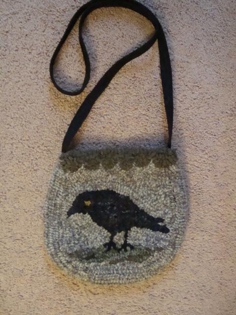 SOLD but if you wish to have one similar, please contact me. Black Crow hooked purse with scallop top. The scallop top is in a green wool to compliment the blue/grey and green textured wool background. There a bluish rayon lining which has a small pocket to accommodate car keys, lipstick or small cell phone. There is also a cloth covered snap closure at the top middle of the purse. The purse measures 9" x 9 1/2" and is hooked only on the front side. $68 plus shipping For more hooked items please look on page two. |