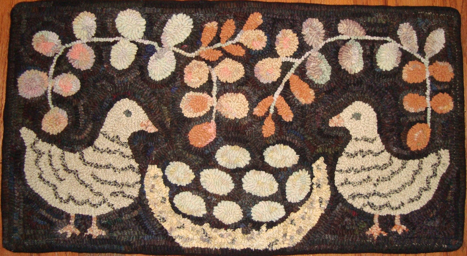 Magdalena Briner Eby was a prolific rug hooker from Pennsylvania who hooked rugs in the 1800's. She has become one of the most well-known primitive folk art rug hookers today. The dimensions of this rug is 17" by 22" is hooked on natural primitive linen using 100% woven wool strips in mostly #8.5, for center of flowers I may have used #8. Both over dyed and as is textured wool was used to make this wonderful folk art piece. $225 plus shipping