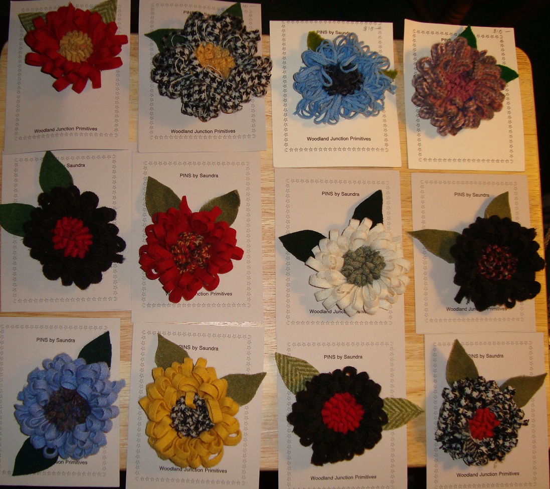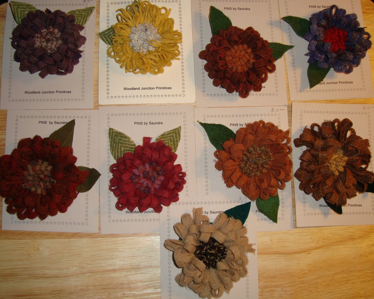 Hooked and prodded flower pins vary in dimension, but the average size of the flower is approx. 3"in diameter. Many of my customers put them on their straw hats in the summer but some just use them to dress up a winter coat or dress. The back of the pin is finished with wool and pin clasp. There are a variety of colors, many more than shown in this picture; just ask for your favorite choice of colors and I will e-mail a picture to you. $10 each plus shipping. |