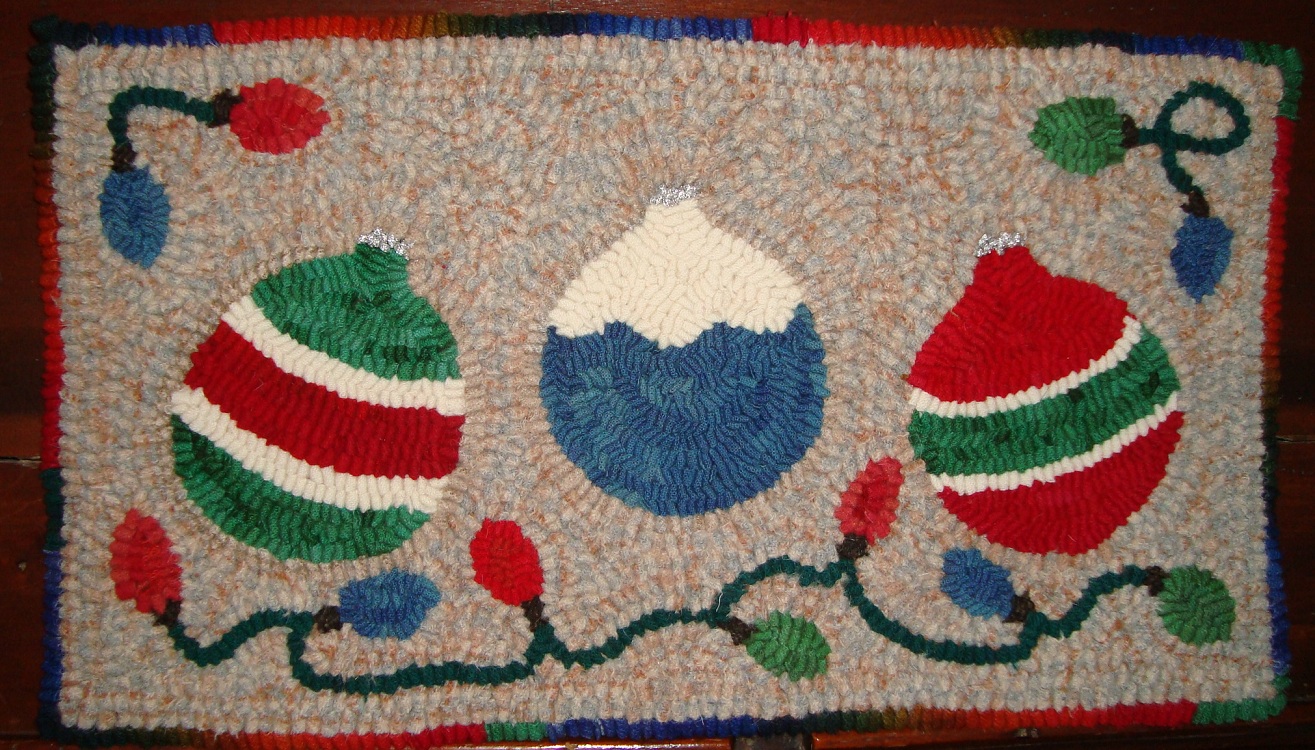 This is my own design called Holiday Ornaments and measures 10 1/2 x 18 1/2. It is wool using both #8 and #8.5 strips with the tops of the holiday balls hooked in a silver metallic yarn. The background is a cream tan and blue textured wool and the ornaments have both as is and over dyed wool. This would be a cute center piece on a table, chest or given a gift, yours for $98 plus shipping |
