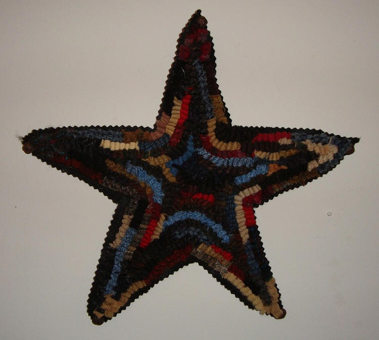 This hand hooked star measures 11" across from point to point. It is hooked using wool strips and is backed with a piece of felt which has been trimmed with pinking shears. There is a hanger attached to the back for hanging but could also adorn a tabletop or chest. Rusty bells are attached to each of the points. Can be yours or a gift to someone else for $24 plus shipping