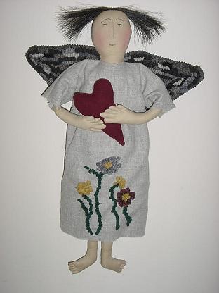 Lillian is made of tea dyed woven cotton; the nose, fingers and toes have been needle sculpted for a more primitive look. Her facial features are embroidered with floss. The wings and flowers on her wool dress have been hooked using #8 wool strips. She is holding a sewn and stuffed wool heart A Kindred Spirits design, Lillian is 26" tall and sells for $70 + shipping.