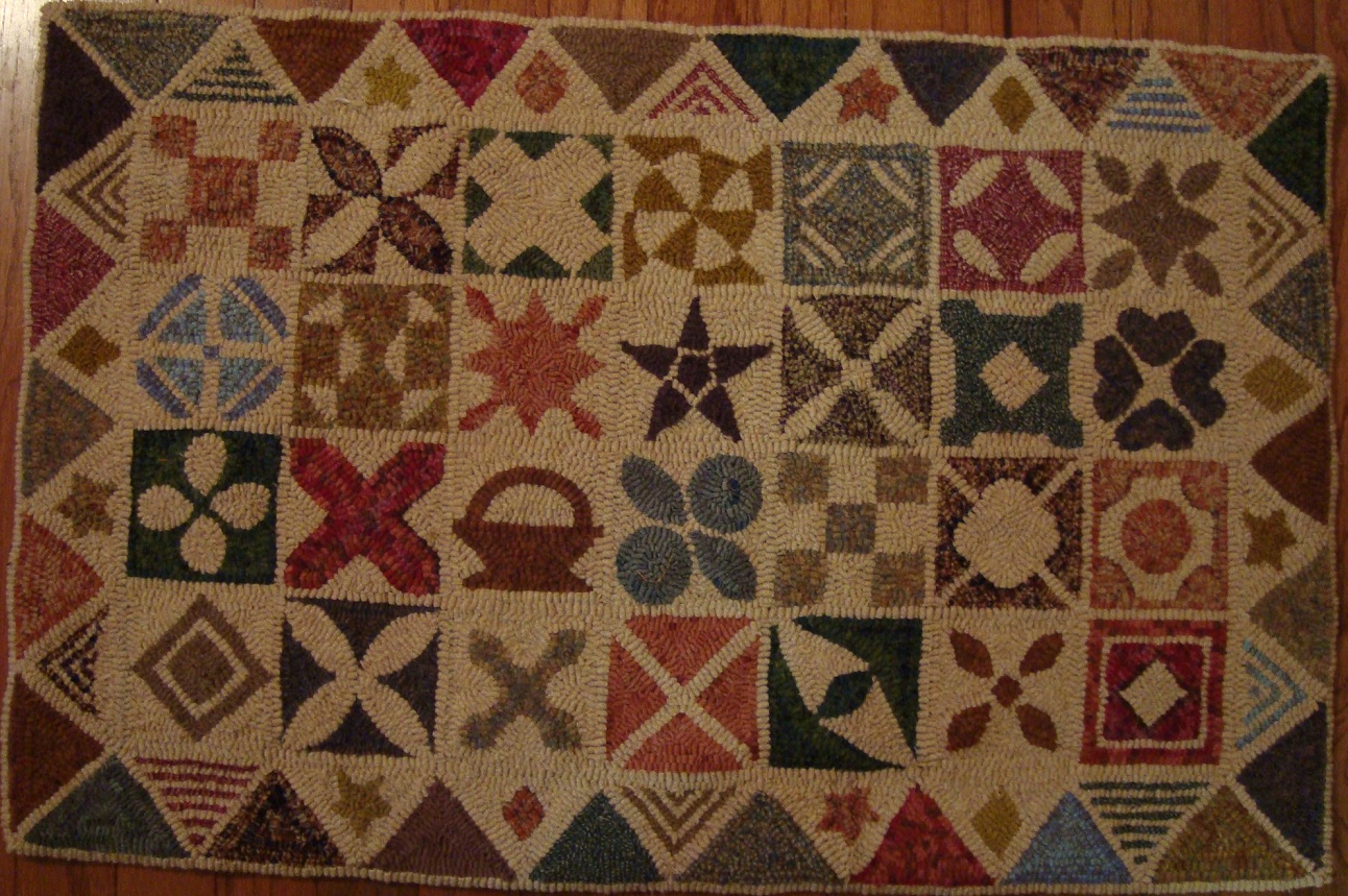This rug was inspired by the Jane A. Stickle quilt which was made in 1863. I chose only a few of the numerous quilt pieces she originally had in her quilt but the rug still measures 26" x 40 1/2". This is a nice size to hang on the wall, lay on an antique chest and would be beautiful in a room where quilts are displayed. It is hooked using 100% wool fabric on primitive natural linen foundation. Yours for $695 + shipping.