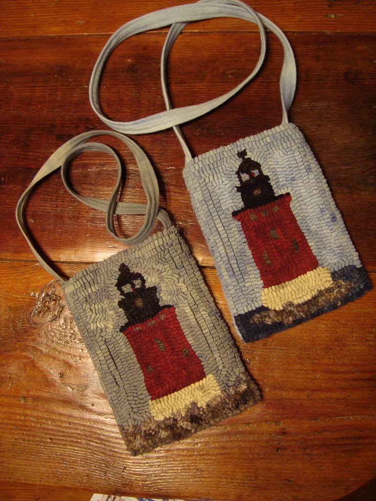 Look at these attractive purses. The image is of the Delaware Breakwater Lighthouse. They are hand hooked on one side with a solid piece of wool on the back and lined with a snap closure. The wool is hand dyed by me and is mainly hooked in #8 cut strips (1/4" wide). They measure 7" x 9" , light weight and ideal to carry particularly in the summer as it is large enough for credit card and cash, cell phone, car keys and lipstick. You would be the talk of the town when worn at a beach resort. The purse on the left has sold but the one on the right is still available. Sold individually, $55 + shipping.