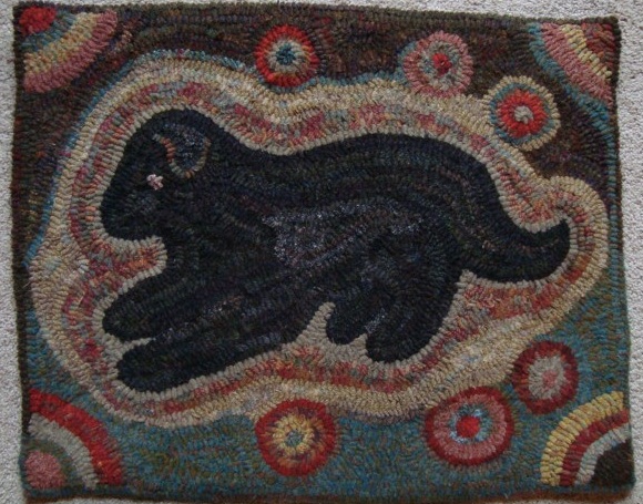 This is the latest project just off my hooking frame. It is an adaptation of a design by Polly Minick called Daleview Farm. This rug measures 15 x 25, is hooked on primitive natural linen with 100% wool using cuts of #8 and #8.5. It is bound with black cotton binding. Sells for $195 + shipping. |