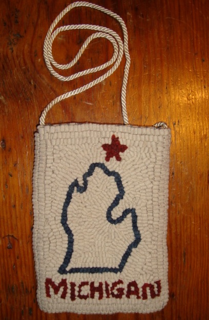 ![]() It has been said that when people from Michigan meet one another they hold up their hand (in the shape of the mitten) and point to the area they are from. Therefore the Michigan Mitt purse. It measures 7" x 9" deep, the perfect size for needfuls like credit card, cash, cell phone, car keys and lipstick. It is hand hooked on the front using 100% woven wool strips and a solid piece of wool for the back. It comes lined with pillow ticking and has a snap closure. Sells for $55 + shipping. |