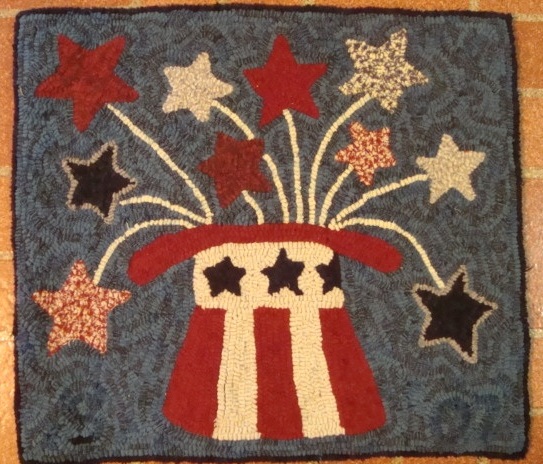 Uncle Sam's Hat and Stars. Wouldn't this be a great piece to display for July 4th and other patriotic days? Keep it yourself or give as a gift to someone in the military or to family who may have a relative in the military. This is a design by Polly Minick; it measures 18 1/2" x 21 1/2" and hooked in #8 wool strips (1/4" wide). Can be yours for $220 plus shipping