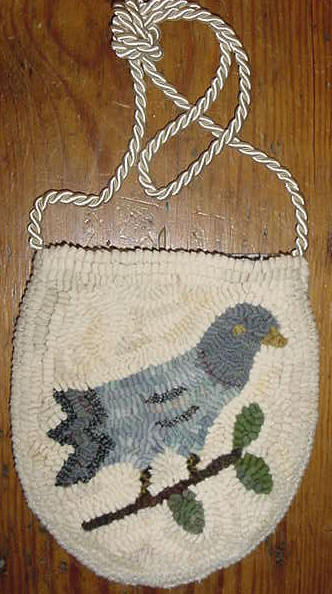 SOLD This elegant yet folk-style Blue Bird hooked purse measures 8 1/2" across the fullest part and 9 1/2" from top to bottom. It has been hooked using hand dyed wool, has a blue rayon lining and off white twist wrap strap. There is a snap closure and an inside small pocket for keys or lipstick. Only the front is hooked, the back is woven off-white wool. $68 plus shipping.