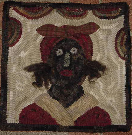 This is my design and based on a woman I knew from the age of 3 years old. She was a wee bit of a woman who helped care for my ailing grandmother. Auntie Peanut loved our family as much as we loved her and she used to say that my hair was so curly that I looked just like Shirley Temple. The mat measures 12 1/2" x 12 1/2" and is hooked using #8 wool strips. Her kerchief bow is a piece of wool which I stitched into place to look three-dimensional and her hair is natural wool roving to give that dimensional look again. A sleeve has been sewn in the back so it is ready to use as a wall hanging. $85 plus shipping.