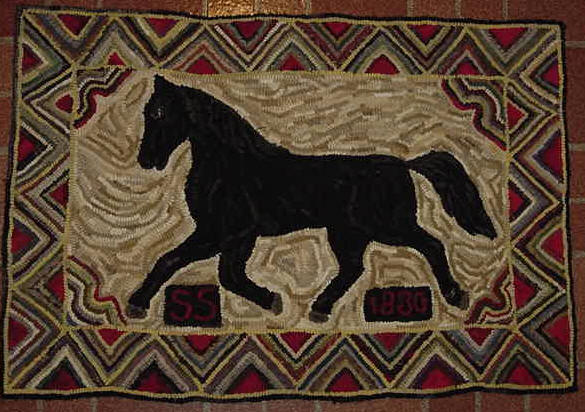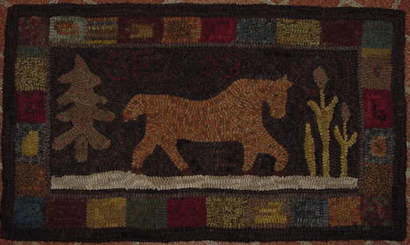 Debbie's Horse measures 17" x 29 1/4" and is a design by Woolley Fox. I hooked the rug using #8 and #8.5 wool strips. The earthy colors gives it an old look and the lighter color at the bottom grounds the piece. It would look lovely above a fireplace, on a harvest table, at a cabin or a gift for that horse lover you know. $275 plus shipping.