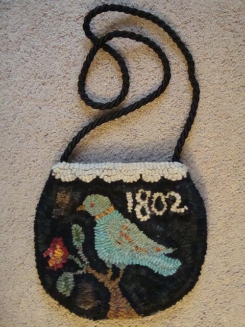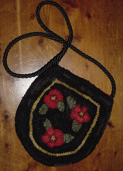 sold This has been sold but will be making another real soon. if you are interested, please contact me. This purse is inspired by a design of Lori Brechlin of Notforgotten Farm. This is hooked in #8 and #8.5 wool strips some of which was hand dyed by me and some as is wool. The purse is fully lined with a black rayon fabric which has a small pocket inside to accommodate lipstick, car keys or small cell phone. There is a cloth covered snap closure. The back is solid wool not hooked on the back and measures 9" x 9 1/2". $68 plus shipping.