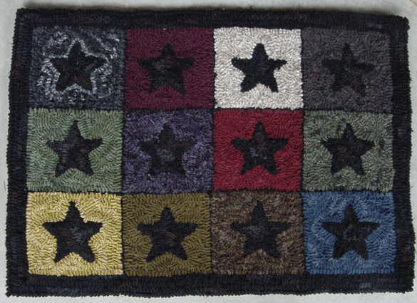 Hit and Miss Folk Art Stars rug measures 17" x 24". It is hand hooked on Scottish Burlap using 1/4" wool strips. The burlap foundation has serged edges which are turned under and covered with a wide cotton binding tape hand stitched. The wool used is a combination of as is and hand dyed wool. Great for the wall, table top, on top of a chest or on the floor ~ Yours for $225 + shipping. |