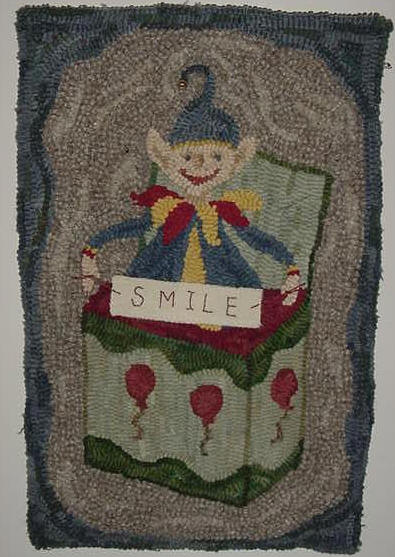 The Jack-in-the-Box is ready to be used as a wall hanging or could be displayed on a dresser of a child's room. This would make a wonderful gift for an expectant parent or even your own child's room. It measures 12" x 18 1/2", has been hooked using both hand dyed wool and as is textured wool. At the tip of the cap there is a gold bell and in it's hands is a woolen piece of wool with the word 'Smile' stitched using embroidery floss. I could customize the piece by embroidering the child's name and replace the one that is presently shown. Or, if you want no sign you can easily remove the 'Smile' wording with just a couple snips of thread holding it in place . Yours for $105 plus shipping.