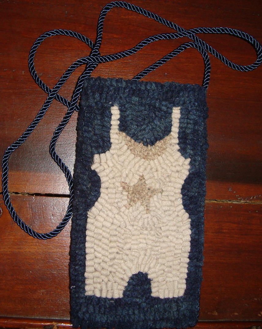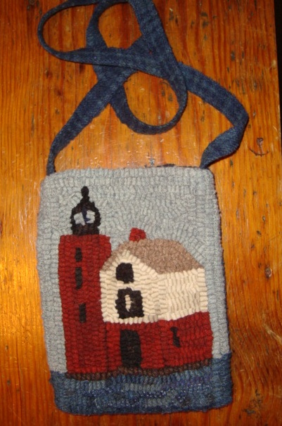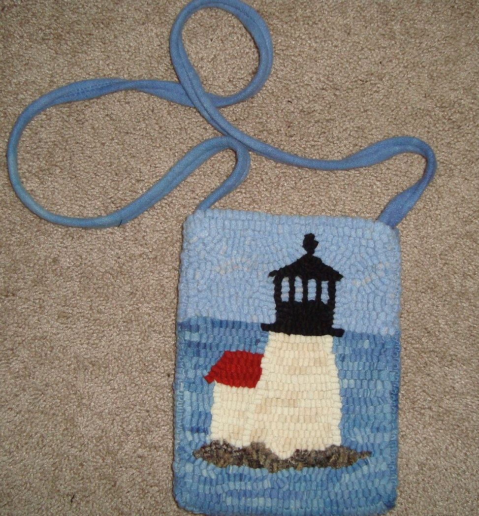 A lighthouse bag would make a perfect statement while vacationing at the beach and it is light weight and big enough to carry credit cards, cash, cell phone and car keys. It measures 7" x 9" and is hand hooked using 100% woven wool on the front and the back. The back is hooked using the same blue as in the water and the strap. It is lined with stripe pillow ticking and has a snap closure. Yours for $55 + shipping.