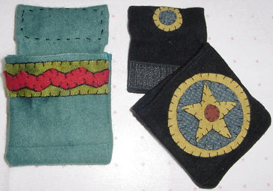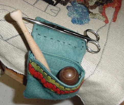 SnipTuck Keeper 4 Everyone tries to make a better mouse trap and I think I've made one. The first picture to the right shows how the pouch portion is attached with Velcro. This way if you use the keeper to hold your snippets, it can be removed from the magnet without removing the magnets and scissors from the frame. The second picture shows how I use my Snip-n-Tuck Keeper; I put my scissors on the top magnet and my hooks in the pouch. There is a heavy piece of canvas sewn into the bottom to prevent the hooks from penetrating the wool. The Snip-n-Tuck Keeper is $25 plus shipping. I am always creating more styles, colors and shapes, please e-mail me if you wish to see a picture of the ones I have in stock now or would like a special order. I recently had a guy request a more manly one with no appliqué at all, and in a grey herringbone.