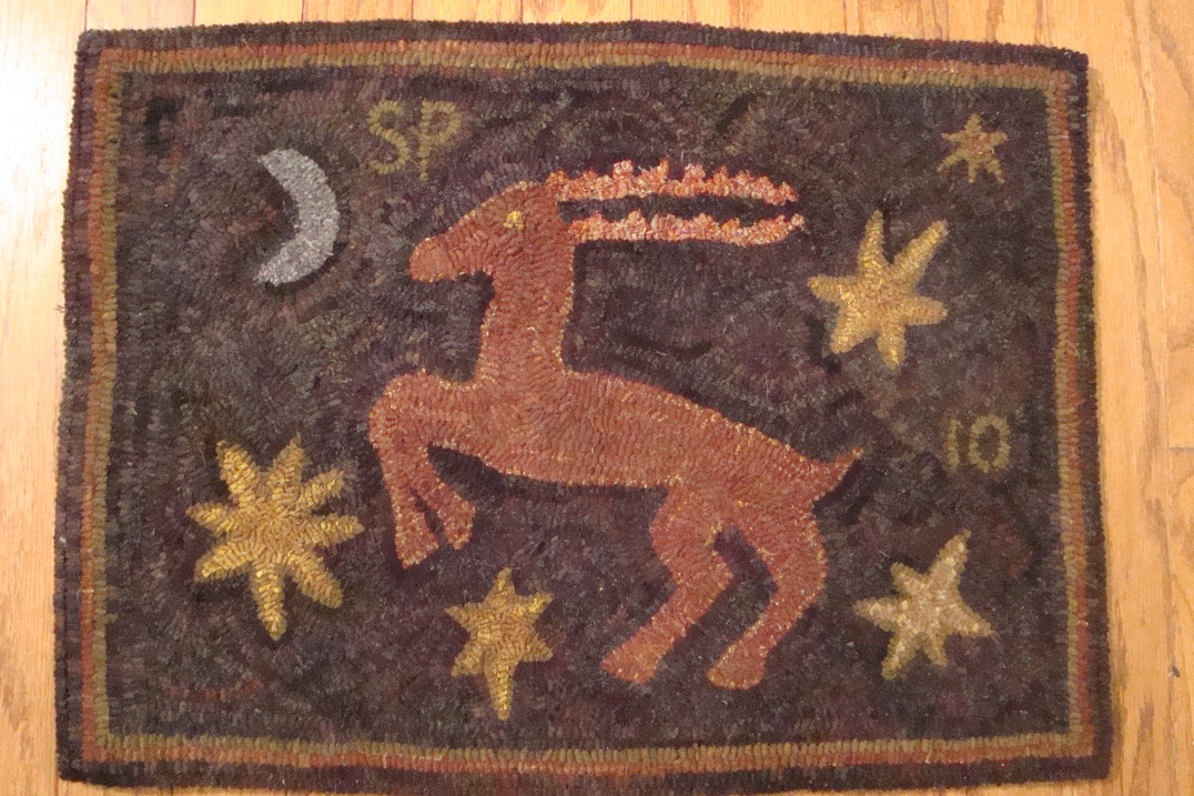 ![]() This Stag Rug is an antique adaptation of a rug originally hooked in the 1800's. It measures 20 1/2" x 28" and is hooked using #8 and #8.5 wool strips of as is textures and hand dyed wool. It is hooked on natural linen backing. This would look marvelous over a fireplace mantle at the hearth of a fireplace, on an antique chest or harvest table. $340 plus shipping.
