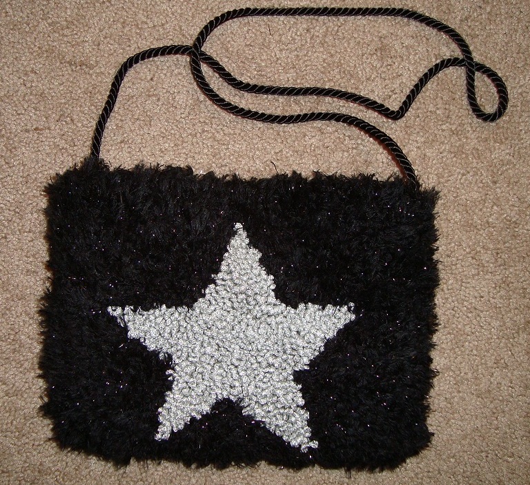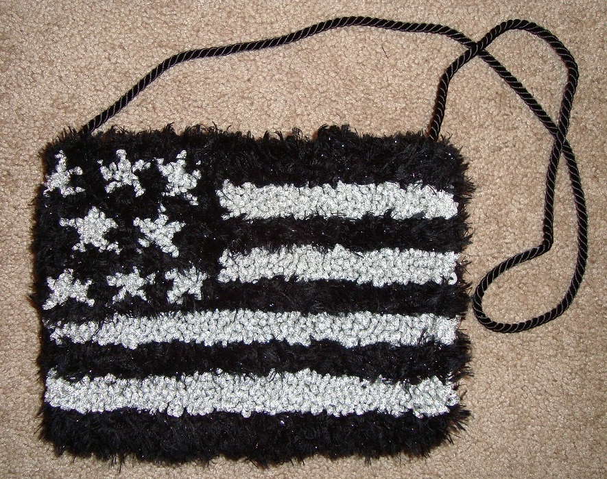 Two-in-One elegant Stars and Stripes Evening Bag has been hand hooked using silver sparkle yarn and black shiny eyelash yarn and measures 7" x 9". One side has a large hooked star and the other has the stars and stripes. The inside has a textured rayon lining and has a rayon twisted cord strap. There is a snap closure. Yours for $60 plus shipping.