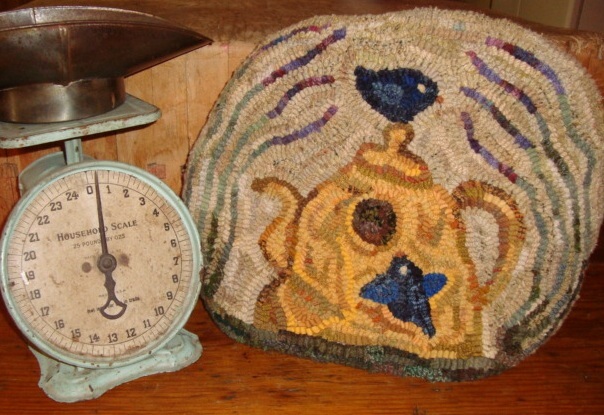 Isn't this an adorable tea cozy? Actually it could be used to cover a two-slice toaster, tea pot or hide those meds you keep out in the kitchen so they aren't an eye sore. Heck, you could also hang it or use it on the table as a hot plate because it does lay flat. The inside is lined with a gold colored cotton fabric which has been sewn to a stabilizer to help it stand. The back is a flattering neutral textured wool. This is a design by Primitive Spirit and hooked by me in both #8 and #8.5 wool strips on primitive linen. Can be yours for $125 plus shipping.