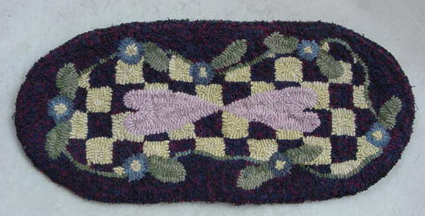 The checkerboard oval table runner is 10" x 22 1/2". It is hand hooked using a combination of hand dyed wool and 'as is' wool. The border and dark checker squares are a very dark blue and burgundy plaid which hooks up really nicely and makes a mottled look. The remainder of the wool used is all hand dyed by me. This is a Kindred Spirits design that would look great in any decor ~ antiques, shabby chic, cottage, or traditional. It is $125 + shipping.